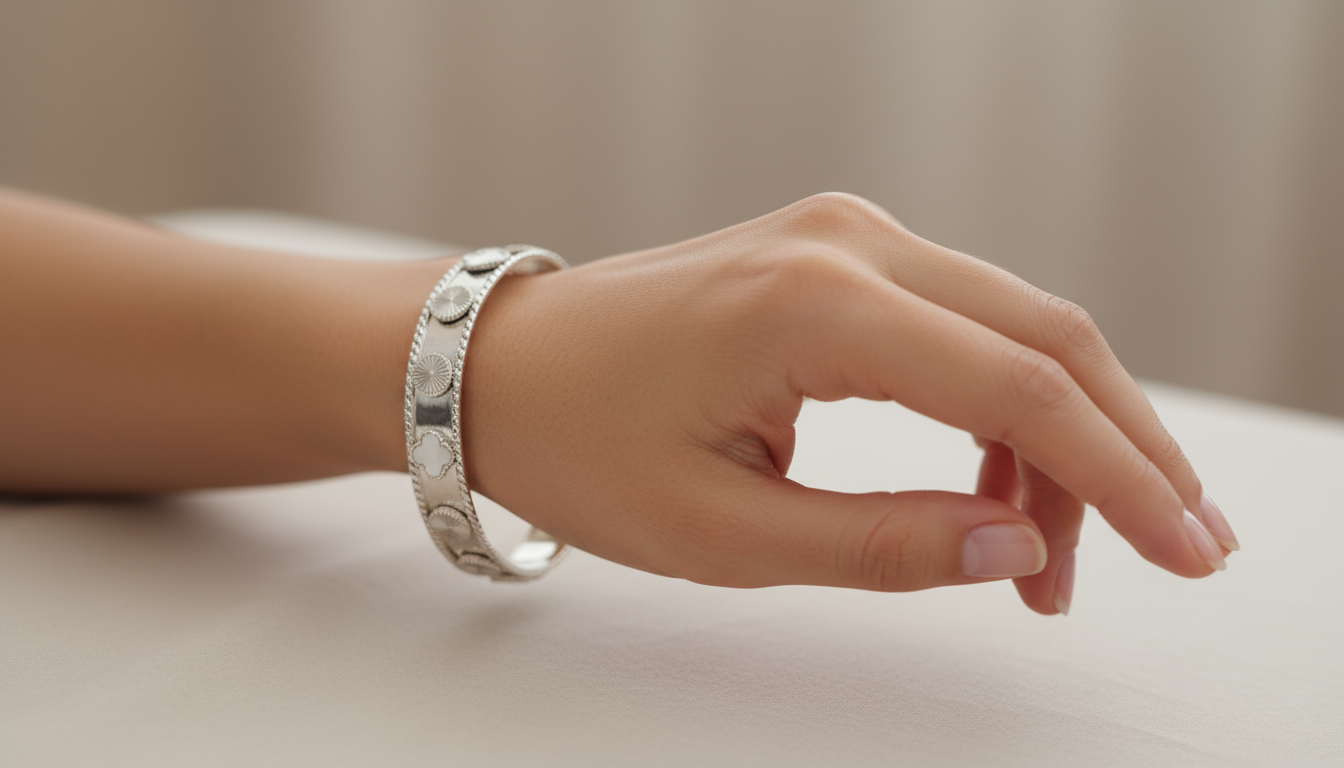 دستبند النگویی نقره زنانه ونکلیف ترکیب تراش و صدف